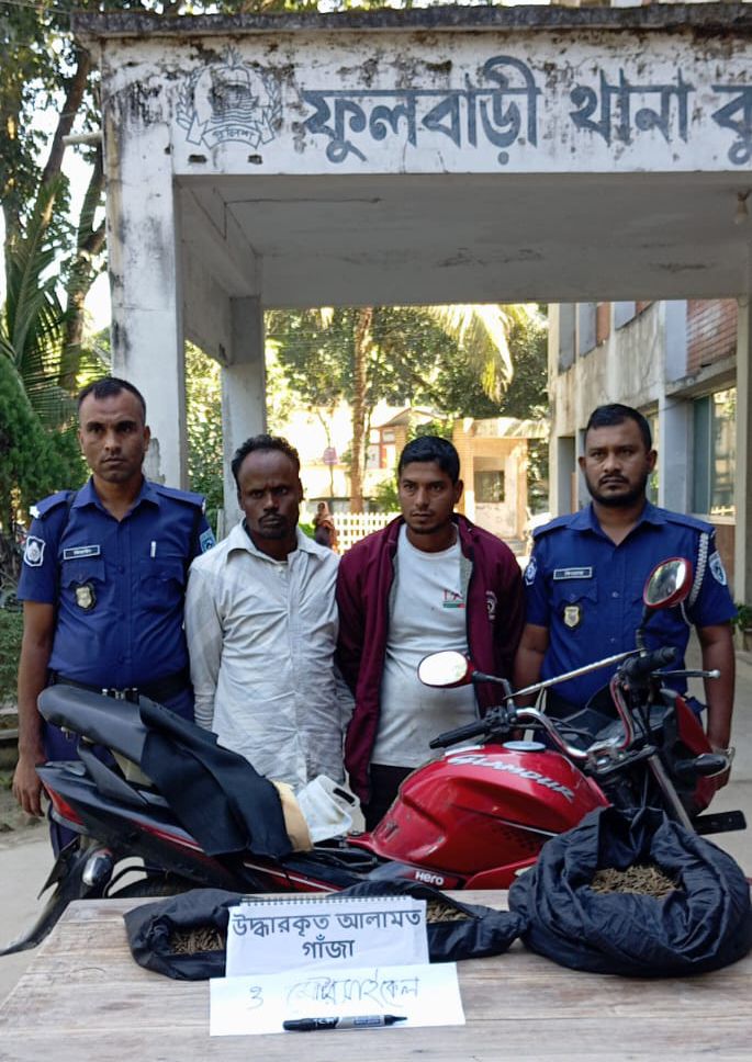 কুড়িগ্রামের ফুলবাড়ীতে পুলিশের মাদকবিরোধী বিশেষ অভিযানে সারে চার কেজি গাঁজা এবং মাদক পরিবহনে ব্যবহৃত একটি রেজিস্ট্রেশনবিহীন মোটরসাইকেলসহ দুই ব্যক্তিকে আটক করেছে পুলিশ।