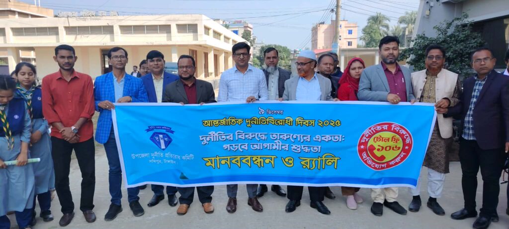‘দুর্নীতির বিরুদ্ধে তারুণ্যের ঐক্য, গড়বে আগামীর শুদ্ধতা’—এ প্রতিপাদ্যকে সামনে রেখে টাঙ্গাইলের সখীপুরে আন্তর্জাতিক দুর্নীতিবিরোধী দিবস পালিত হয়েছে। মঙ্গলবার উপজেলার বিভিন্ন কর্মসূচির মধ্য দিয়ে দিবসটি উদযাপন করা হয়।