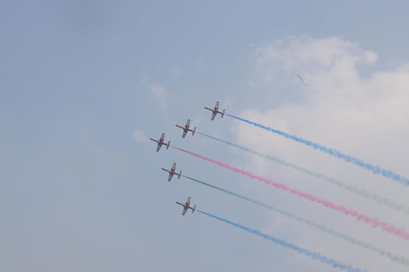 বেলা সাড়ে ১১টার দিকে শুরু হওয়া এয়ার শোতে অংশ নেওয়া উড়োজাহাজগুলো আকাশে ছড়িয়ে দেয় নানা রঙের ধোঁয়া। জাতীয় পতাকার লাল-সবুজের পাশাপাশি দেখা যায় বিভিন্ন রঙের নান্দনিক প্রদর্শনী। হেলিকপ্টারগুলো বহন করে জাতীয় পতাকা ও সশস্ত্র বাহিনীর পতাকা।