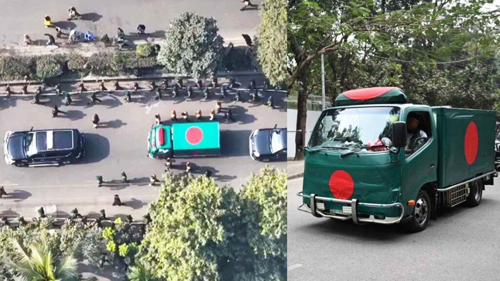 কঠোর নিরাপত্তা ও রাষ্ট্রীয় প্রোটোকলের মধ্য দিয়ে সাবেক প্রধানমন্ত্রী ও বিএনপি চেয়ারপারসন বেগম খালেদা জিয়ার মরদেহ জাতীয় সংসদ ভবনের দক্ষিণ প্লাজায় আনা হয়েছে। লাল-সবুজ রঙের জাতীয় পতাকায় মোড়ানো একটি ফ্রিজার ভ্যানে করে তার মরদেহ বহন করা হয়। এ সময় সেনাবাহিনী হিউম্যান চেইন তৈরি করে নিরাপত্তা নিশ্চিত করে।