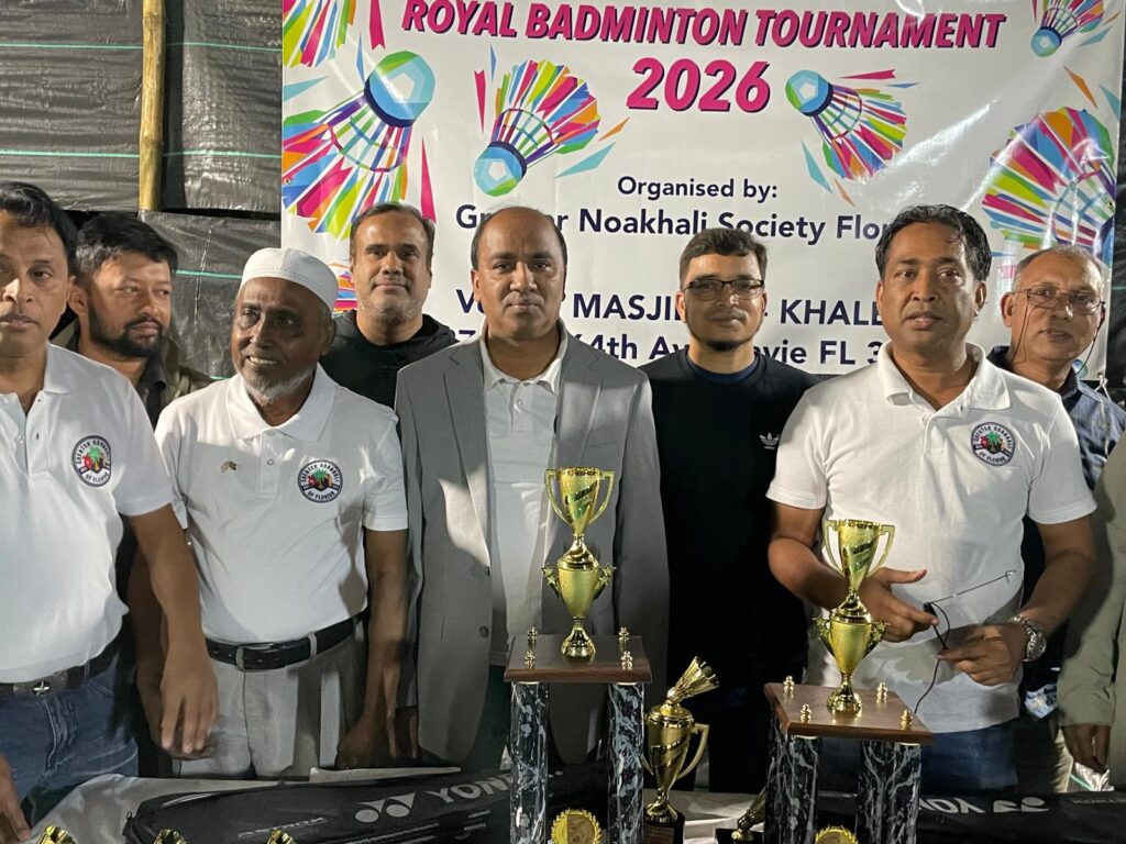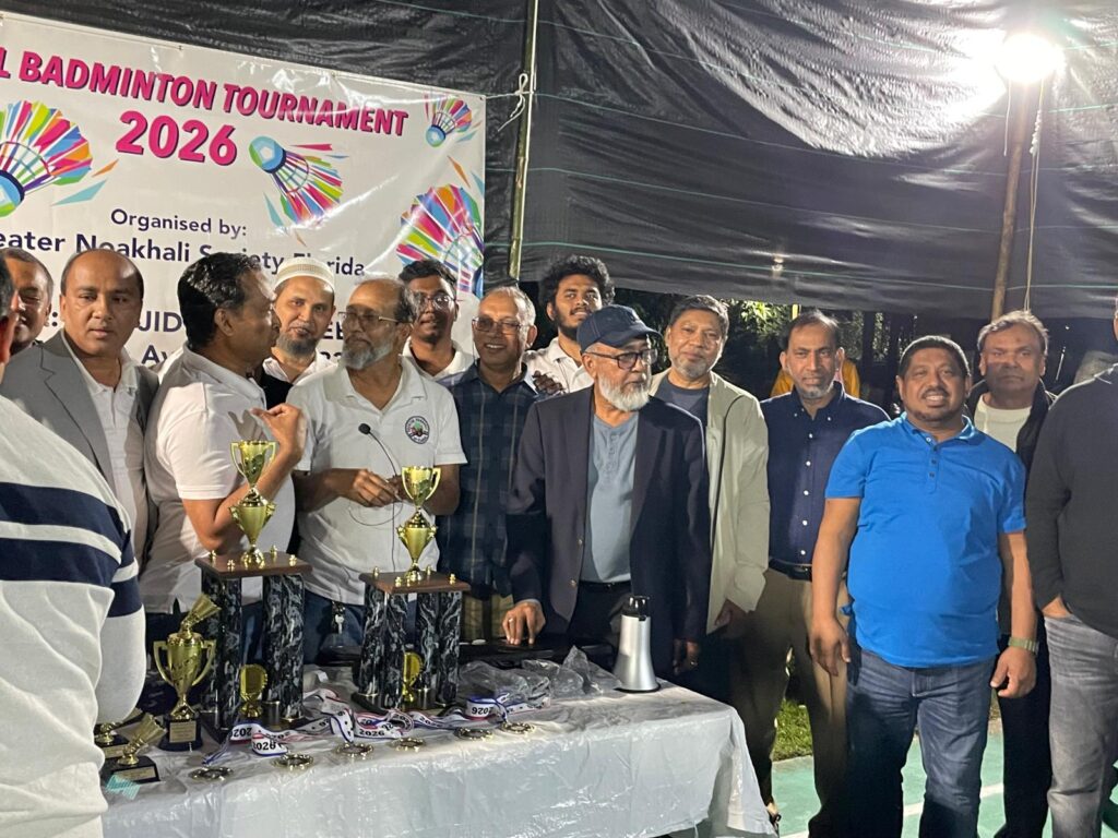 যুক্তরাষ্ট্রের বসবাসকারীর ফ্লোরিডার নোয়াখালী সোসাইটি ফ্লোরিডা রয়াল ব্যাডমিন্টন টুর্নামেন্টের ২০২৬ গত ২-৫ জানুয়ারির অনুষ্ঠিত হয়। ৪ দিন ব্যাপী এই প্রতিযোগিতার উদ্বোধন করেন সম্মিলিতভাবে মোঃ গিয়াস উদ্দিন. মোঃ ফয়েজ আলম. মোঃ মনির উদ্দিন. মোঃ মহসিন. সিরাজ উদ্দিন. মোঃ নাছির. আতিক. শাহিন চৌধুরী. জুয়েল। টুর্নামেন্টে