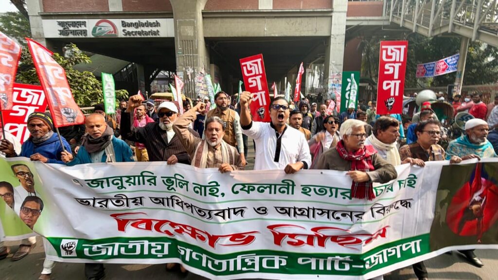 আজ বুধবার (৭ জানুয়ারি) সকালে ফেলানী হত্যা দিবস উপলক্ষে রাজধানীর বিজয়নগর-পল্টন এলাকায় ভারতীয় আধিপত্যবাদ ও আগ্রাসন বিরোধী জাগপা আয়োজিত বিক্ষোভ মিছিল শেষে প্রেসক্লাবের সামনে সংক্ষিপ্ত সমাবেশে তিনি এসব কথা বলেন।