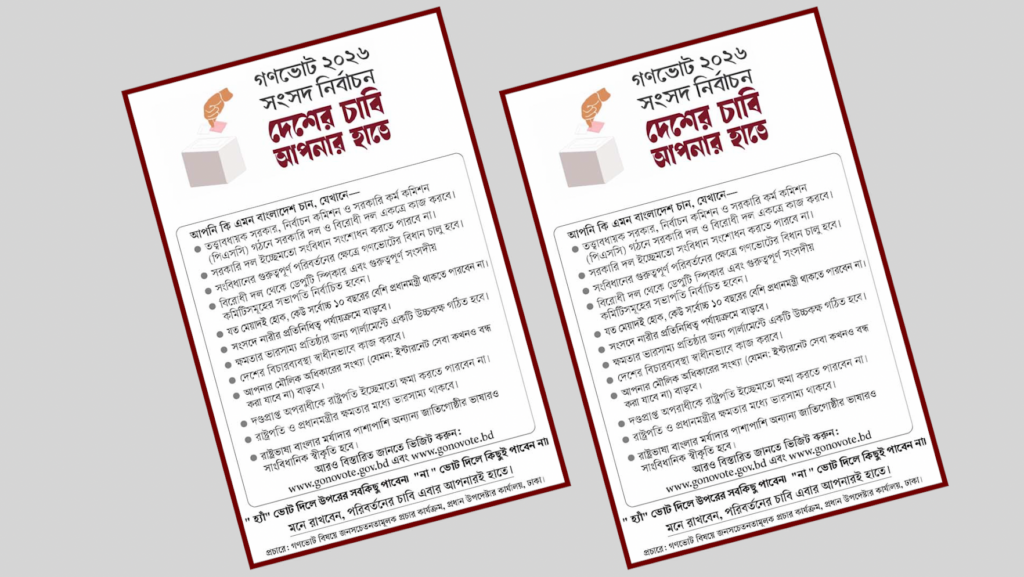 এছাড়া ভোটকেন্দ্র, রিটার্নিং কর্মকর্তার কার্যালয় ও মাঠপর্যায়ের অফিসগুলোতে গণভোটসংক্রান্ত আলাদা ব্যানার ও প্রচার সামগ্রী প্রদর্শনের নির্দেশ দিয়েছে নির্বাচন কমিশন।