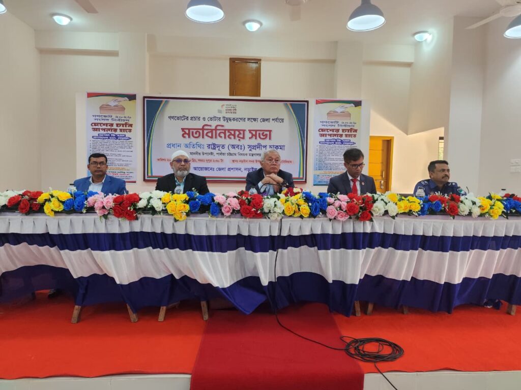 পার্বত্য চট্টগ্রাম বিষয়ক মন্ত্রাণালয়ের উপদেষ্টা সাবেক রাষ্ট্রদুত সুপ্রদীপ চাকমা বলেছেন, ‘এই গণভোটটা হবে আনন্দের সাথে, উৎসাহের সাথে। কারন, এই গণভোটেই আমার ভবিষ্যৎ নির্ধারণ করে দেবে, আমি কেমন বাংলাদেশ চাই।’ আসন্ন ত্রয়োদশ জাতীয় সংসদ নির্বাচনকে সামনে রেখে মঙ্গলবার (২০ জানুয়ারি) বিকাল ৪ টায় নড়াইল জেলা প্রশাসনের আয়োজনে সদর উপজেলা পরিষদ অডিটরিয়ামে গণভোটের প্রচার ও ভোটার উদ্বুদ্ধকরণের লক্ষ্যে অনুষ্ঠিত মতবিনিময় সভায় এসব কথা বলেন।