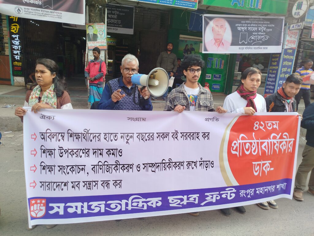 সমাজতান্ত্রিক ছাত্রফ্রন্টের ৪২তম প্রতিষ্ঠাবার্ষিকী উপলক্ষে রংপুর নগর শাখার উদ্যোগে প্রেসক্লাব চত্বরে সামনে বুধবার সকালে মানববন্ধন সমাবেশ অনুষ্ঠিত হয়। সংগঠনের মহানগর শাখার সাধারণ সম্পাদক উত্তম কুমার দাসের সঞ্চালনায় সভাপতিত্ব করেন মহানগর শাখার সভাপতি ও কেন্দ্রীয় সদস্য যুগেশ ত্রিপুরা। সমাবেশে বক্তব্য দেন রংপুর-৩ সদর আসনে প্রার্থী ও রংপুর জেলা বাসদের আহবায়ক জননেতা কমরেড আব্দুল কুদ্দুস, বেরোবি শাখার সভাপতি ছাত্রনেতা রিনা মুরমু, পলিটেকনিক কলেজের শিক্ষার্থী অর্ক। সমাবেশ থেকে বাসদের জেলা আহবায়ক আব্দুল কুদ্দুস বলেন, ৬২’র শিক্ষা আন্দোলন,মহান মুক্তিযুদ্ধ ও ২৪শের গণঅভুত্থানের অন্যতম আকাঙ্খা হলো বৈষম্যহীন গণতান্ত্রিক শিক্ষা ব্যবস্থা । অথচ শিক্ষা বর্তমানে মুনাফা কেন্দ্রিক হওয়ায় পর্যদুস্ত, ধ্বসে পড়েছে শিক্ষার মান, শিক্ষাঙ্গনে নেই গণতান্ত্রিক পরিবেশ। স্বাধীনতার ৫৫ বছর পরেও শাসকগোষ্ঠী শিক্ষাকে বাণিজ্যে পরিণত করেছে। সমাবেশে নেতৃবৃন্দ বলেন,বিভিন্ন শিক্ষা প্রতিষ্ঠানে নানারকম মব সন্ত্রাস চলছে। পরিকল্পিতভাবে একটি মবগোষ্ঠী বেগম রোকেয়া বিশ্ববিদ্যালয়ে নাম পরিবর্তনে ষড়যন্ত্র সহ দেশের কলেজ-বিশ্ববিদ্যালয়গুলোর বিভিন্ন ইন্সটিটিউট ও একাডেমিক ভবন,হলের নাম পরিবর্তনের মহোৎসব চালাচ্ছে। সমাবেশ থেকে বক্তারা এহেন অপতৎপরতার তীব্র নিন্দা ও ক্ষোভ জানান। ছাত্র নেতৃবৃন্দ এসব কর্মকাণ্ড বন্ধ করতে প্রশাসনের প্রতি উদাত্ত আহবান জানান। সভাপতি যুগেশ ত্রিপুরা বলেন, কলেজ-বিশ্ববিদ্যালয়গুলোতে নানা নামে বেনামে ফি বৃদ্ধি করা হচ্ছে। শিক্ষকদের নানাভাবে হেনস্তা অব্যাহত আছে এবং ট্যাগিং এর রাজনীতি চলছে, এসব বন্ধ করতে হবে। নেতৃবৃন্দ অতিদ্রুত সারাদেশের মাধ্যমিক স্কুলে শিক্ষার্থীদের হাতে সব পাঠ্যবই দেয়ার জন্য সংশ্লিষ্ট কর্মকর্তাদের আহবান জানান। একইসাথে শিক্ষা,সংস্কৃতি ও মনুষ্যত্ব রক্ষায় ছাত্র রাজনীতির আদর্শবাদী ধারাকে শক্তিশালী করতে ছাত্র সমাজের প্রতি উদাত্ত আহ্বান জানান।