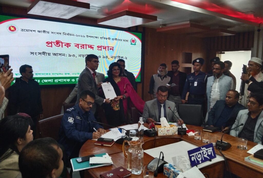 আসন্ন ত্রয়োদশ জাতীয় সংসদ নির্বাচনে নড়াইলের দু’টি সংসদীয় আসনে প্রতিদ্বন্দ্বী ১৬ প্রার্থীর মধ্যে প্রতীক বরাদ্দ করা হয়েছে। বুধবার (২১ জানুয়ারি) জেলা রিটার্নিং কর্মকর্তা ও জেলা প্রশাসক ড. মোহাম্মদ আবদুল ছালাম দলীয় ও স্বতন্ত্র প্রার্থীদের মধ্যে প্রতীক বরাদ্দ করেন। এসময় প্রার্থী ও তাঁদের সমর্থকেরা উপস্থিত ছিলেন।