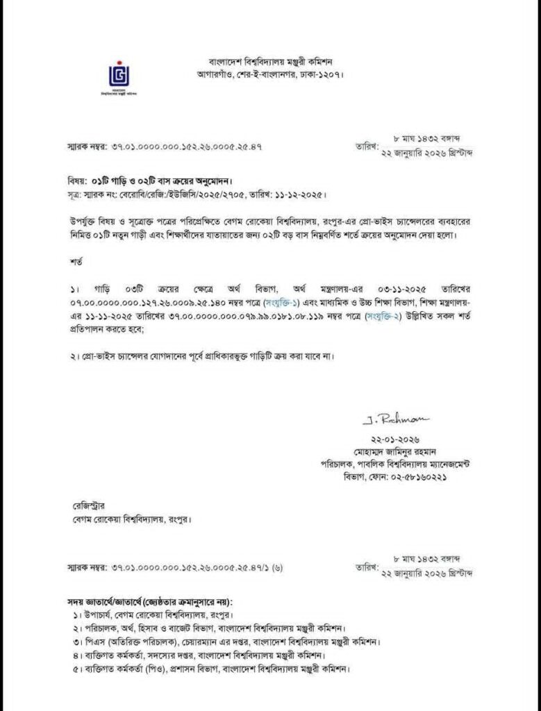 এতে আরও উল্লেখ করা হয়, অর্থ বিভাগ ও অর্থ মন্ত্রণালয়ের সংশ্লিষ্ট অনুমোদন সাপেক্ষে গাড়ি ও বাসগুলো ক্রয় করতে হবে। পাশাপাশি, প্রো-ভাইস চ্যান্সেলরের যোগদানের আগে গাড়িটি ক্রয় করা যাবে না বলেও শর্ত আরোপ করা হয়েছে।