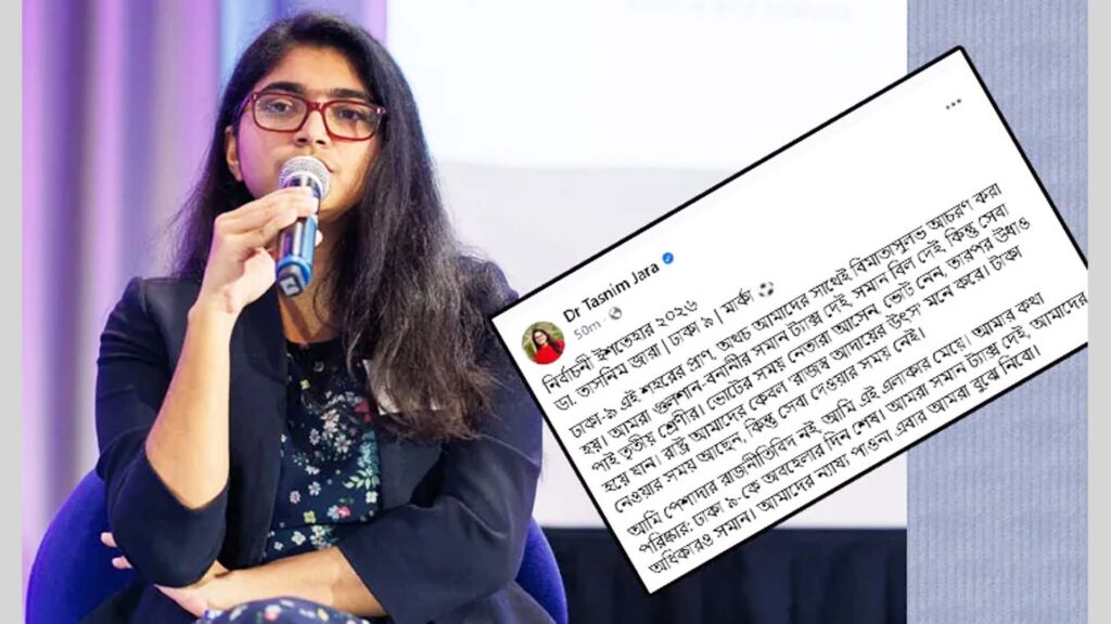 ডা. তাসনিম জারা লিখেছেন, “ঢাকা-৯ এই শহরের প্রাণ, অথচ আমাদের সঙ্গে আচরণ হয় বিমাতাসুলভ। আমরা গুলশান-বনানীর সমান ট্যাক্স দিই, সমান বিল দিই, কিন্তু সেবা পাই তৃতীয় শ্রেণির। ভোটের সময় নেতারা আসেন, ভোট নেন, তারপর উধাও হয়ে যান। রাষ্ট্র আমাদের এটিএম মেশিন ভাবেন—টাকা নেওয়ার সময় থাকেন, সেবা দেওয়ার সময় নেই। আমি পেশাদার রাজনীতিবিদ নই, আমি এই এলাকার মেয়ে। আমার কথা পরিষ্কার: ঢাকা-৯-এর অবহেলার দিন শেষ। আমাদের অধিকারও সমান, এবার ন্যায্য পাওনা আমরা নিজেই নিশ্চিত করব।”