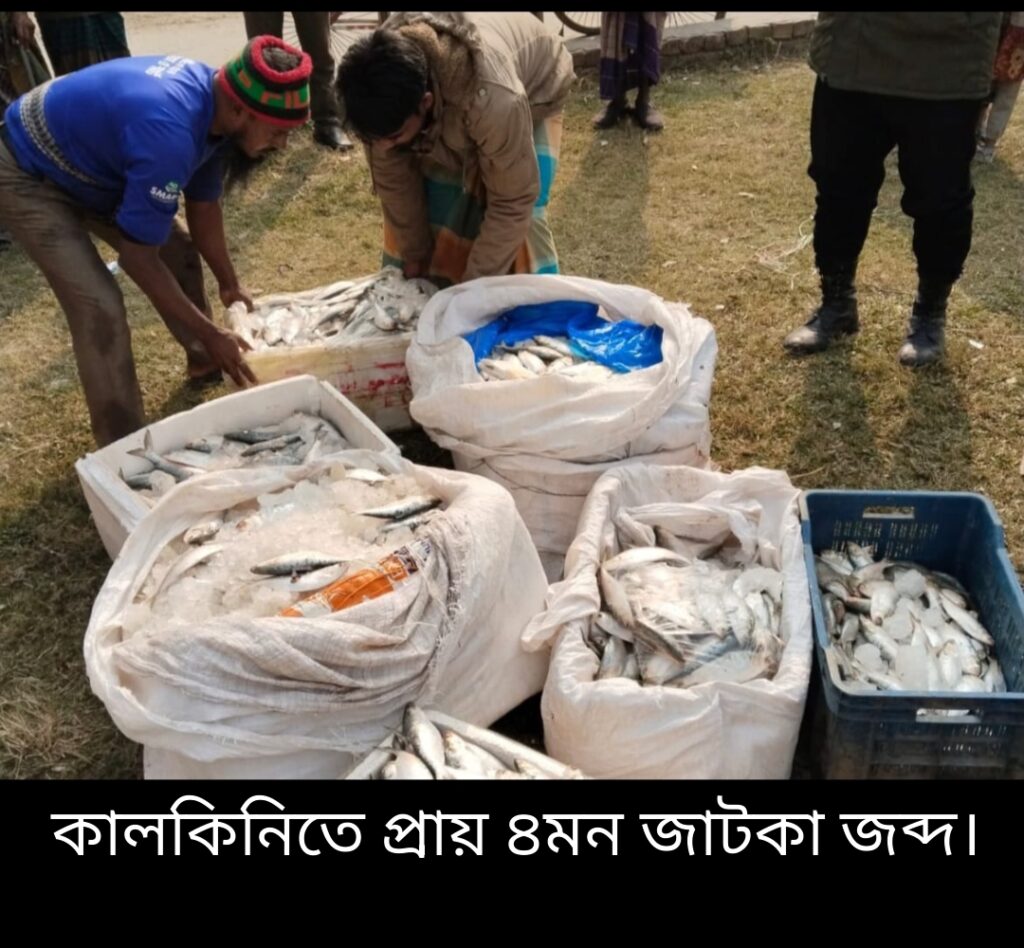মাদারীপুরের কালকিনিতে অভিযান চালিয়ে প্রায় ৪ মণ জাটকা ইলিশ জব্দ করেছে ভ্রাম্যমাণ আদালত। এসময় জাটকা বিক্রির অভিযোগে মোট ২৮ হাজার টাকা জরিমানা করা হয়। রবিবার (২৫ জানুয়ারি) সকালে কালকিনি বাজারের বিভিন্ন এলাকায় এই অভিযান পরিচালনা করেন উপজেলা নির্বাহী কর্মকর্তা সাইফ উল আরেফিন। অভিযানে উপজেলা মৎস্য বিভাগ ও কালকিনি থানা পুলিশের সদস্যরা অংশ নেন। ভ্রাম্যমাণ আদালত সূত্রে জানা যায়,গোপন সংবাদের ভিত্তিতে কালকিনি উপজেলার বিভিন্ন বাজারে অভিযান পরিচালনা করে ভ্রাম্যমাণ আদালত। এসময় প্রায় ৪ মণ জাটকা জব্দ করা হয়। পরে জাটকা বিক্রির অভিযোগে বিভিন্ন মাছ ব্যবসায়ীকে মোট ২৮ হাজার টাকা জরিমানা করা হয়। পরবর্তীতে নির্বাহী ম্যাজিস্ট্রেটের নির্দেশে জব্দকৃত জাটকা মাছগুলো স্থানীয় বিভিন্ন এতিমখানা ও মাদরাসায় বিতরণ করা হয়। উপজেলা নির্বাহী কর্মকর্তা সাইফ উল আরেফিন জানান,”ইলিশের উৎপাদন বাড়াতে সরকার জাটকা ধরা, পরিবহন, মজুদ ও বিক্রি নিষিদ্ধ ঘোষণা করেছে। কেউ এ আইন অমান্য করলে তার বিরুদ্ধে কঠোর আইনি ব্যবস্থা গ্রহণ করা হবে। ভবিষ্যতে এ ধরনের অভিযান অব্যাহত থাকবে।