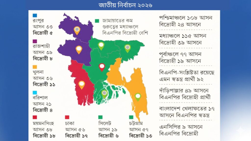 উত্তরবঙ্গ, মধ্যাঞ্চল ও দক্ষিণ-পশ্চিমাঞ্চলের বেশ কয়েকটি আসনে বিএনপির বিদ্রোহী প্রার্থীদের কারণে জামায়াত ও তাদের শরিক দলগুলো মূল লড়াইয়ে চলে এসেছে। দিনাজপুর, গাইবান্ধা, নাটোর, নওগাঁ, পাবনা, বাগেরহাট, যশোর ও সাতক্ষীরার মতো জেলাগুলোতে এই বিভাজন জামায়াতের জয়ের সম্ভাবনা বাড়িয়েছে।