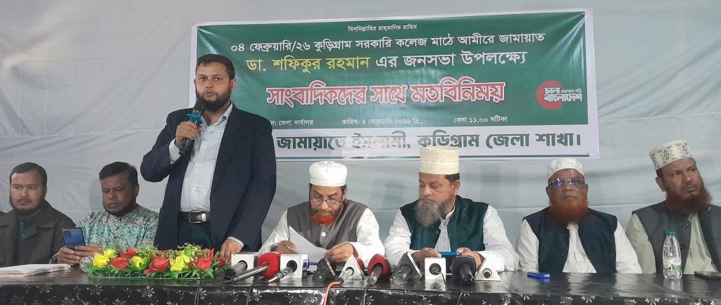 আগামী ৪ ফ্রেব্রুয়ারি কুড়িগ্রামে নির্বাচনী জনসভায় বাংলাদেশ জামায়াত ইসলামীর আমির ডা. শফিকুর রহমানসহ ১১ দলীয় জোট নেতাদের আগমন উপলক্ষে সাংবাদিকদের সাথে মতবিনিময় সভা অনুষ্ঠিত হয়েছে।