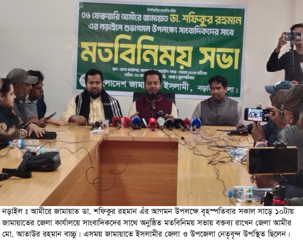 নড়াইলে নির্বাচনী জনসভায় অংশ নিতে বাংলাদেশ জামায়াত ইসলামীর আমীর ডা. শফিকুর রহমানসহ ১১ দলীয় জোট নেতাদের আগমন উপলক্ষ্যে সাংবাদিকদের সাথে মতবিনিময় সভা অনুষ্ঠিত হয়েছে। বৃহস্পতিবার (৫ ফেব্রুয়ারি) সকাল সাড়ে ১০টায় শহরের আলাদাতপুর এলাকায় নিজস্ব কার্যালয়ে এ মতবিনিময় সভা অনুষ্ঠিত হয়। অন্যান্যের মধ্যে মতবিনিময় সভায় উপস্থিত ছিলেন, জেলা জামায়াতের আমীর ও নড়াইল —২ আসনের সংসদ সদস্য প্রার্থী মো. আতাউর রহমান বাচ্চু, সাধারণ সম্পাদক ও নড়াইল —১ আসনের সংসদ সদস্য প্রার্থী ওবায়দুল্লাহ কায়সার, জেলা প্রচার সম্পাদক ড. খান আব্দুস সুবহানসহ নেতৃবৃন্দ এবং জেলার কর্মরত ইলেকট্রনিক ও প্রিন্ট মিডিয়ার সাংবাদিক বৃন্দ।