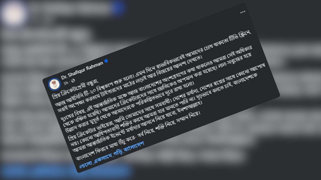 তিনি দেশের ক্রিকেটারদের প্রতি সহমর্মিতা প্রকাশ করে লিখেছেন, “প্রিয় ক্রিকেটার ভাইদের প্রতি আমার সমব্যথা। দেশের মর্যাদা ও স্বপ্নের সঙ্গে কোনো আপস নেই।”