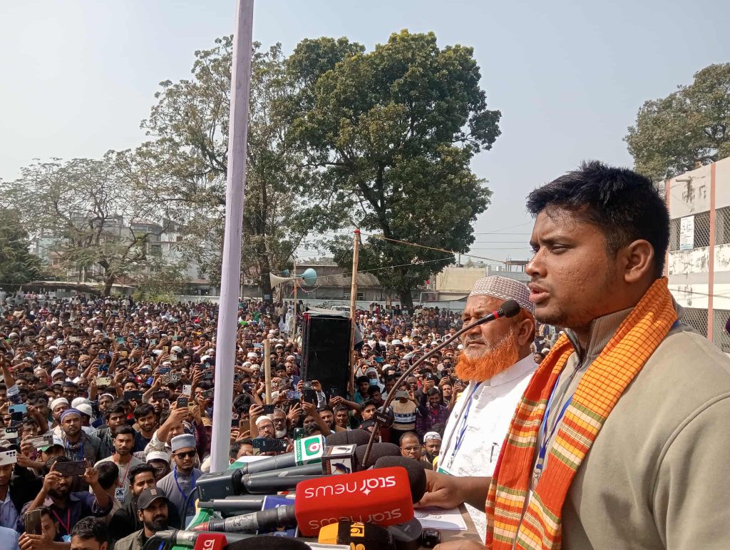 হাসনাত আবদুল্লাহ ৮ ফেব্রুয়ারী ২০২৬ রবিবার সকাল ১০ টায় শাহজাদপুর সরকারি কলেজ মাঠে ১১–দলীয় নির্বাচনী ঐক্যের জনসভায় বিশেষ অতিথির বক্তব্যে এ কথা বলেন। সিরাজগঞ্জ -৬ শাহজাদপুর আসনে এনসিপি মনোনীত জামায়াত ও ১২ দলীয় জোট সমর্থিত প্রার্থী এস এম সাইফ মোস্তাফিজের সমর্থনে আয়োজিত নির্বাচনী জনসভার সভাপতিত্ব করেন শাহজাদপুর উপজেলা জামায়াতের আমীর সহকারি অধ্যাপক মিজানুর রহমান। প্রধান অতিথির বক্তব্য রাখেন, বাংলাদেশ জামায়াতে ইসলামীর কেন্দ্রীয় সহকারী সেক্রেটারী ও উল্লাপাড়া আসনে জামায়াতের প্রার্থী মাওলানা রফিকুল ইসলাম খাঁন। উপজেলা জামায়াতের সেক্রেটারী মাষ্টার আব্দুল মালেক ও এনায়েতপুর থানা জামায়াতের সেক্রেটারী ডাঃ মোফাজ্জল হোসেনের সঞ্চালনায় জনসভায় আরও বক্তব্য রাখেন, জেলা ছাত্রশিবিরের সেক্রেটারী রেজওয়ানুল্লাহ শোয়াইব, জেলা জাতীয় যুব শক্তির আহ্বায়ক আল মামুন, উপজেলা ছাত্রশিবির উপজেলা ছাত্রশিবিরের পম্চিম সভাপতি সামিউল ইসলাম, পূর্ব সভাপতি আতিকুর রহমান, শাহজাদপুর পৌর জামায়াতের আমীর আমিনুল ইসলাম, সাবেক উপজেলা জামায়াতের আমীর মাওঃ আব্দুল খালেক, উপজেলা খেলাফত মজলিসের আমীর মাওঃ নজরুল ইসলাম, কলেজ ছাত্র শিবির সভাপতি সজিব শেখ প্রমুখ।