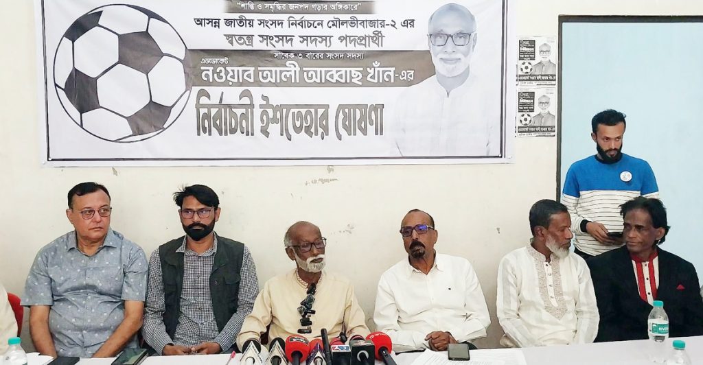 ত্রয়োদশ জাতীয় সংসদ নির্বাচনে স্বতন্ত্র সংসদ সদস্য প্রার্থী (ফুটবল) বর্ষিয়ান রাজনীতিবিদ এডভোকেট নওয়াব আলী আব্বাছ খাঁন নিজের অভিজ্ঞতাকে কাজে লাগিয়ে কুলাউড়ার উন্নয়নে আমৃত্যু কাজ করতে চান। দীর্ঘদিন থেকে তিনি কুলাউড়ার মানুষের সুখ-দুঃখ, সমস্যা ও সম্ভাবনার সাথে যুক্ত ছিলেন। বিগত সময়ে তিন বার সংসদ সদস্য নির্বাচিত হয়ে তার অভিজ্ঞতাকে সমৃদ্ধ করেছেন। মানুষের ভালোবাসা ও দোয়ায় এলাকার মানুষের জীবনমান উন্নয়নে অবদান রাখবো।