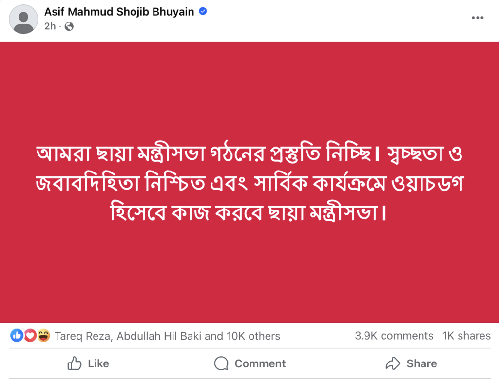 পোস্টে তিনি বলেন, ‘আমরা ছায়া মন্ত্রিসভা গঠনের প্রস্তুতি নিচ্ছি। স্বচ্ছতা ও জবাবদিহিতা নিশ্চিত এবং সার্বিক কার্যক্রমে ওয়াচডগ হিসেবে কাজ করবে ছায়া মন্ত্রীসভা।’
