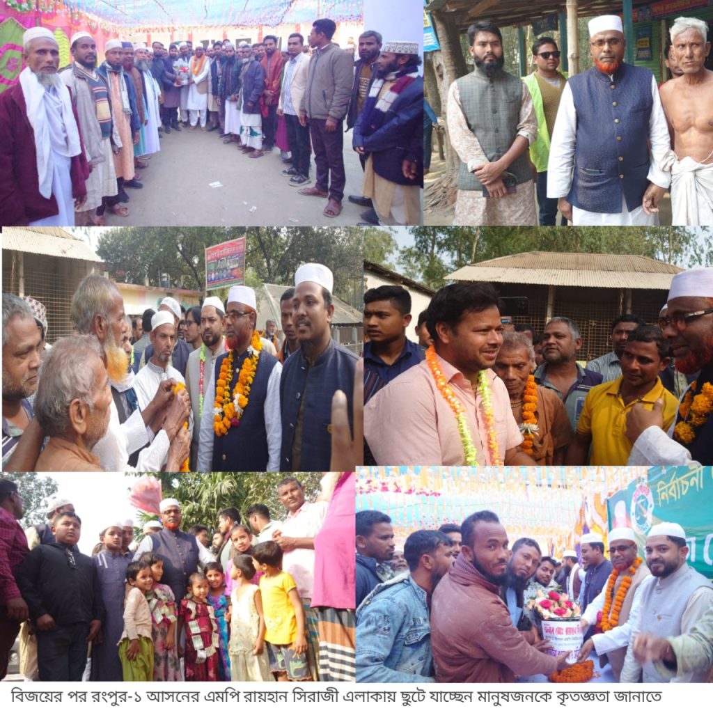 ত্রয়োদশ জাতীয় সংসদ নির্বাচনে রংপুর-১ (গঙ্গাচড়া ও সিটি অংশ) আসন থেকে বিপুল ভোটে বিএনপি প্রার্থীকে পরাজিত করে বিজয়ী হয়েছেন বাংলাদেশ জামায়াতে ইসলামী মনোনীত ও ১১ দলীয় জোটের প্রার্থী মো. রায়হান সিরাজী। নির্বাচনে বিজয়ের পর নবনির্বাচিত এমপি কোনো ধরনের আনন্দ মিছিল, শোভাযাত্রা বা উৎসবে না গিয়ে তিনি ব্যস্ত সময় পার করছেন নির্বাচনি এলাকার সর্বস্তরের মানুষের কাছে কৃতজ্ঞতা জানাতে।
