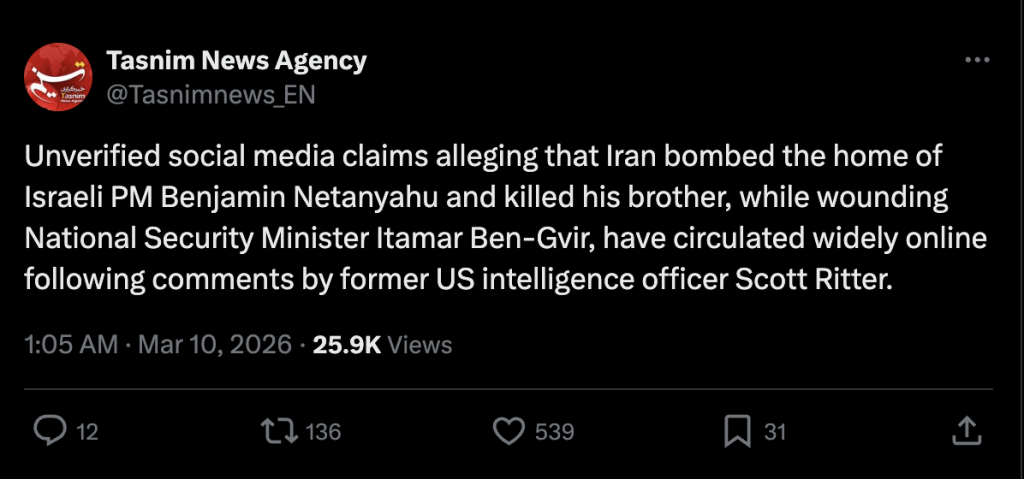 ইরানের সংবাদমাধ্যমে অবশ্য নেতানিয়াহুর নিহত হওয়ার খবর প্রকাশ নতুন কিছু নয়। এর আগে ২ মার্চ কয়েকটি ইরানি সংবাদাধ্যম তাদের প্রতিবেদনে দাবি করছিল, ইরানি ক্ষেপণাস্ত্রের আঘাতে ইসরায়েলের প্রধানমন্ত্রীর দপ্তর ধ্বংস হয়ে গেছে এবং তিনি নিহত হয়েছেন।