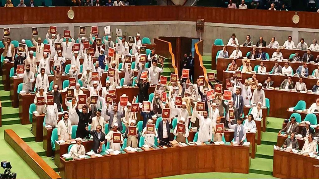 বৃহস্পতিবার (১২ মার্চ) দুপুর ২টার দিকে রাষ্ট্রপতি ভাষণ শুরু করলে প্রথমে জামায়াত আমির ডা. শফিকুর রহমান আসন ত্যাগ করেন, তার পর বাকি বিরোধী সদস্যরাও সংসদ কক্ষে থেকে বের হয়ে যান। তারা ‘গেট গেট গেট আউট, কিলার চুপ্পু গেট আউট’, ‘গণতন্ত্র ফ্যাসিবাদ, এক সাথে চলে না’ মতো স্লোগান দেন এবং ‘গাদ্দার চুপ্পু’ লেখা প্ল্যাকার্ড প্রদর্শন করেন।
