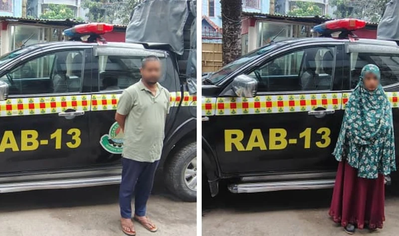 পাওনা টাকা ফেরত চাওয়ায় রুপভান নামে এক নারীকে শ্বাসরোধে হত্যার অভিযোগে দায়ের করা মামলার স্বামী-স্ত্রীকে গ্রেফতার করেছে র্যাব-১৩।সোমবার দুপুরে র্যাব-১৩ সিনিয়র সহকারী পরিচালক অতিরিক্ত পুলিশ সুপার বিপ্লব কুমার গোস্বামী এক সংবাদ বিজ্ঞপ্তিতে এই তথ্য জানান।রোববার রাতে পঞ্চগড় জেলার সদর উপজেলার টুনিরহাট এলাকায় অভিযান চালিয়ে তাদের গ্রেফতার করা হয়।গ্রেফতাররাকৃতরা হলেন নীলফামারীর জলঢাকা উপজেলার নগভক্ত জসিপাড়া এলাকার মো. জাকির হোসেন (৩৫) এবং তার স্ত্রী মোছা. শিউলি বেগম (৩০)।