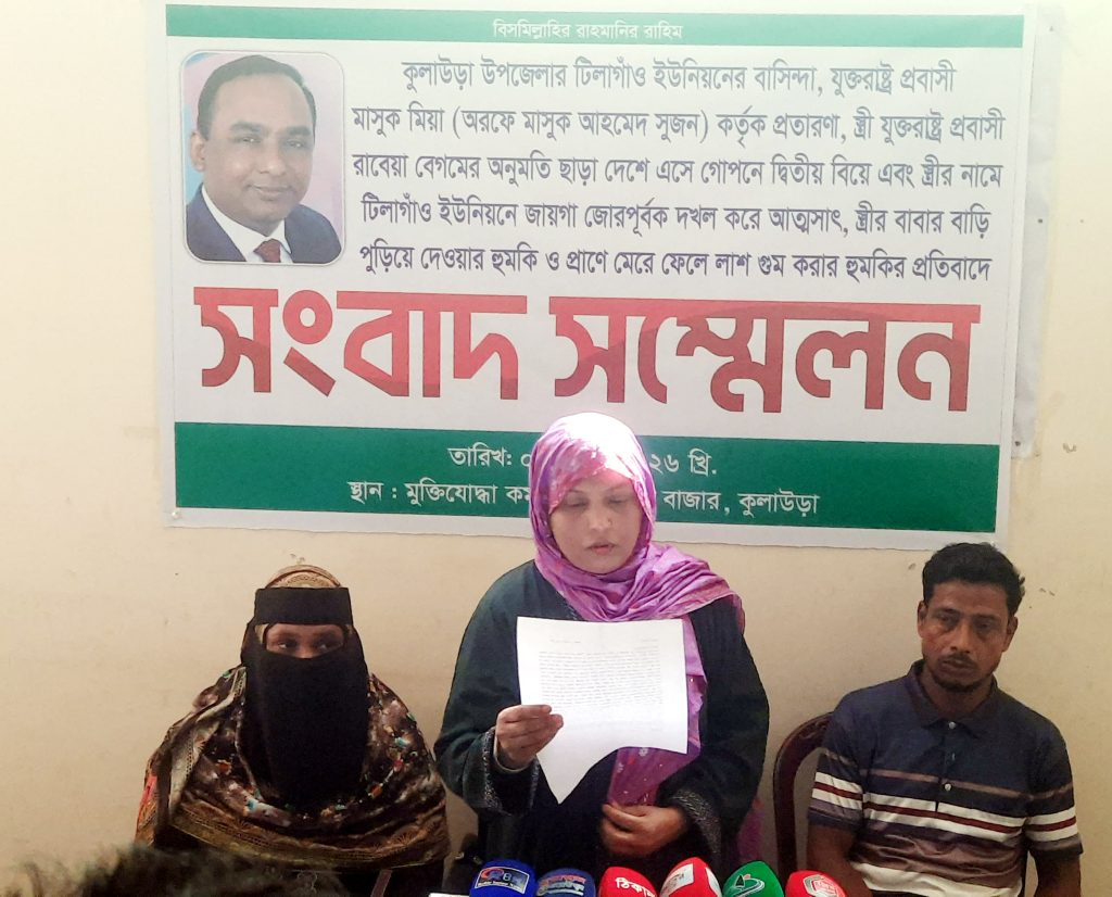 সম্পত্তি দখল ও দ্বিতীয় বিয়ে করায় প্রবাসী স্বামীর বিরুদ্ধে স্ত্রীর সংবাদ সম্মেলন