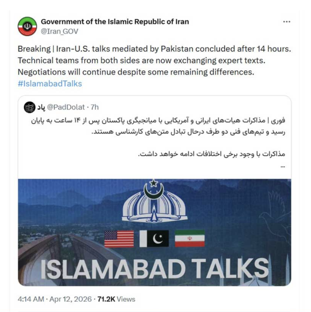 সামাজিক যোগাযোগমাধ্যম এক্স (সাবেক টুইটার)-এ দেওয়া এক পোস্টে ইরান সরকার জানিয়েছে, ইসলামাবাদে অনুষ্ঠিত উচ্চপর্যায়ের বৈঠকের পর দুই দেশের কারিগরি দল এখন বিস্তারিত প্রস্তাব ও ‘বিশেষজ্ঞ পর্যায়ের খসড়া’ বিনিময়ে ব্যস্ত রয়েছে।