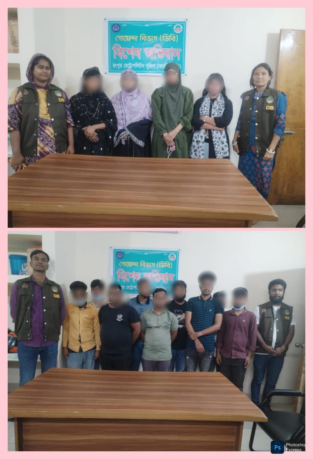 বৃহস্পতিবার (১৬ এপ্রিল) দুপুরে বিষয়টি নিশ্চিত করেন রংপুর মেট্রোপলিটন গোয়েন্দা পুলিশের উপ-পুলিশ কমিশনার সনাতন চক্রবর্তী। গ্রেফতাররা হলেন, সেকেন্দার আলী (৩৫), সম্পদ চন্দ্র (২৩), আকাশ চৌধুরী (২৫), অরণ্য রায় (২৫), নজির হোসেন (২৫), মৃদুল মিয়া (২৩), চয়ন কুমার শীল (২২), মিনহাজুল ইসলাম তাফিম (২৬), তামিম হোসেন (২৯), মৌসুমী আক্তার মুক্তা (২২), ফারজানা খাতুন (১৯), রোকসানা (২৮) ও স্মৃতি আক্তার (২৩)।