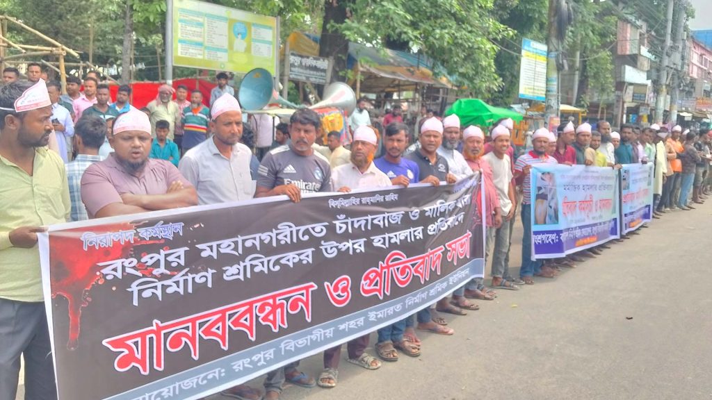 রংপুর মহানগরীতে চাঁদাবাজী ও মালিক দ্বারা নির্মাণ শ্রমিকের উপর হামলার প্রতিবাদে মানববন্ধন ও প্রতিবাদ সমাবেশ পালন করেন রংপুর বিভাগীয় শ্রমিক সমাজ। বৃহস্পতিবার (১৬ এপ্রিল) সকালে নগরীর টাউন হলের সামনে রংপুর বিভাগীয় শহর ইমারত নির্মাণ শ্রমিক ইউনিয়নের আয়োজনে উক্ত মানববন্ধন ও প্রতিবাদ সমাবেশ অনুষ্ঠিত হয়।