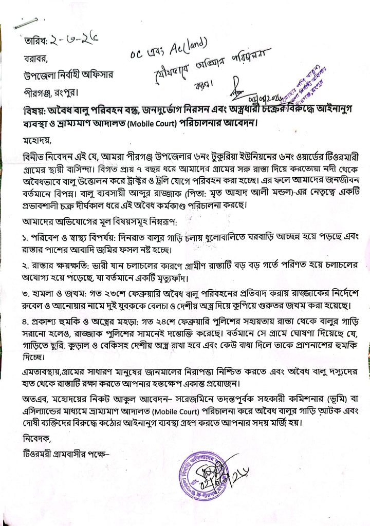 নিরাপত্তা চেয়ে ও অবৈধ বালু পরিবহন বন্ধে টিওরমারী গ্রামবাসী গত ২ মার্চ ইউএনও ও এসিল্যান্ড বরাবর লিখিত আবেদন করেন। তারপরেও কোন প্রতিকার না পেয়ে পরবর্তীতে ৫ এপ্রিল গ্রামবাসীর একটি প্রতিনিধি দল আবারো ইউএনও কার্যালয়ে গেলে উপজেলা নির্বাহী অফিসার আবেদনের ওপর “OC এবং AC (Land) যৌথভাবে অভিযান পরিচালনা করুন” মর্মে লিখিত আদেশ ও স্বাক্ষর প্রদান করেন। কিন্তু অভিযোগ উঠেছে, ইউএনও’র এই স্পষ্ট নির্দেশনার পরও পীরগঞ্জ থানার ভারপ্রাপ্ত কর্মকর্তা (ওসি) এবং সহকারী কমিশনার (ভূমি) বা এসিল্যান্ড কোনো পদক্ষেপ গ্রহণ করেননি।