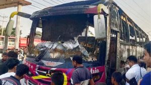 ফুলবাড়ীয়ায় বাসে আগুন, ভেতরেই পুড়ে মারা গেলেন চালক